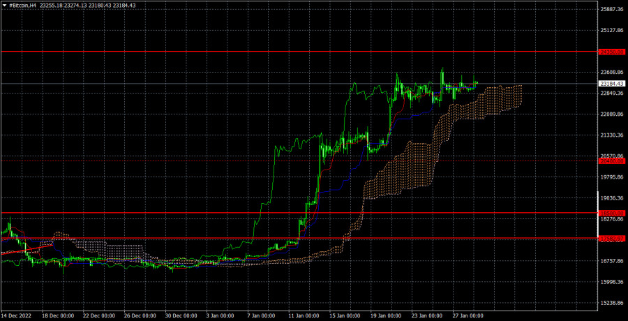 V posledních týdnech jsme soustavně zpochybňovali opodstatněnost navýšení eura. Program zpřísňování stále pokračuje, a Fed stále zvyšuje úrokové sazby. To znamená, že to, že se zpřísňování zpomalilo, neznamená, že se úplně zastavilo. Účastníci trhu mohou přirozeně předvídat některé budoucí události a vzorce. Je však důležité mít na paměti, že sazby pravděpodobně zůstanou vysoké po velmi dlouhou dobu. Podle teorie by tedy rok 2023 neměl zaznamenat žádný významný růst. Mějte také na paměti, že býčí trend u bitcoinu ještě nezačal. Když cena překročí významnou úroveň 24 350 USD, která může sloužit jako horní hranice vedlejšího kanálu, bude možné o takovém trendu diskutovat.