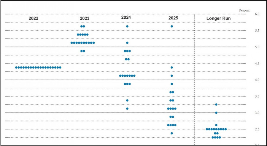 Bodový graf je mechanismus Fedu pro předpovídání budoucích sazeb tím, že 17 představitelů Fedu hlasuje o budoucnosti měnové politiky. Prosincový bodový graf odhalil volbu drtivé většiny, že Fed zvýší sazby na cíl těsně nad 5 % a udrží sazby vysoko po celý kalendářní rok 2023.