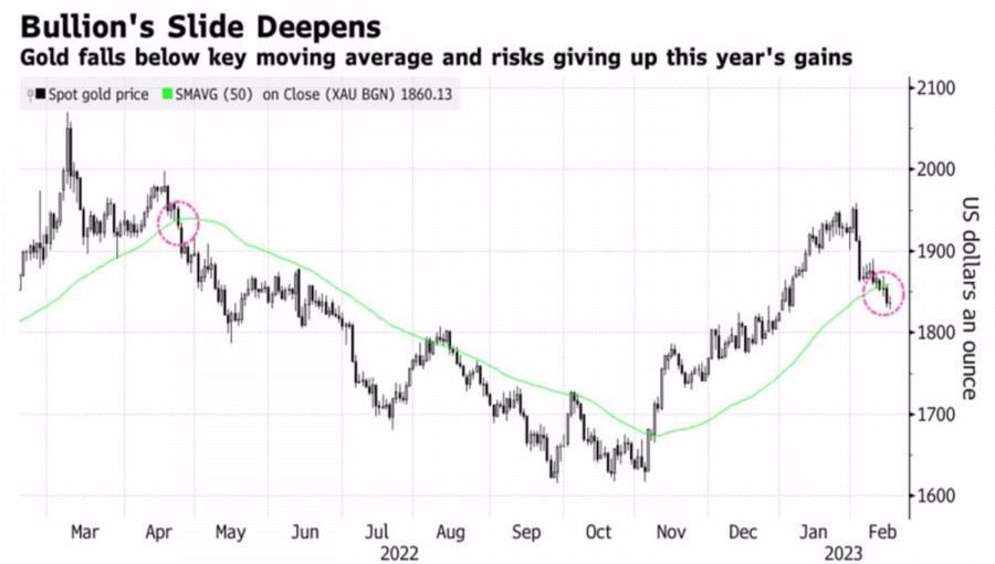 V únoru se očekávaný vrchol sazby federálních fondů začal vzdalovat od skutečné hodnoty. V důsledku toho existoval potenciál pro růst výpůjčních nákladů, výnos 10letých státních dluhopisů za tržních podmínek se přiblížil hranici 4 %, která byla přepsána loni poprvé od roku 2008, a americký dolar posílil. Zlato se muselo vzdát myšlenky vyšplhat se nad 2000 dolarů za unci. Domeček z karet se sesypal a pod troskami bylo mnoho býků. S hrůzou vzpomínají na události z dubna 2021, kdy se přechod grafu s 50denním klouzavým průměrem změnil v novou vlnu prodejů. Podobná situace nastává i nyní.