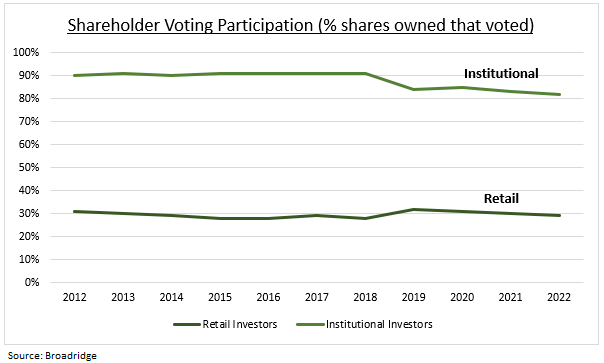 RETAIL: Pozornost investorů se přesouvá na nadcházející období hlasování na valných hromadách. Ty budou pravděpodobně zaměřené na dividendovou politiku, odměňování vedoucích pracovníků a ES, kdy by rostoucí počet drobných investorů zde mohl hrát významnou roli. Tato skupina byla obvykle nedostatečně zastoupena a do hlasování se zapojovala mnohem méně než institucionální investoři (viz graf), ale to se mění. Tento trend přichází na pozadí zvýšeného aktivismu tradičních investorů, od Salesforce po Disney, a s autory 'krátkých reportů', kteří se zabývají většími akciemi, jako je indická Adani.