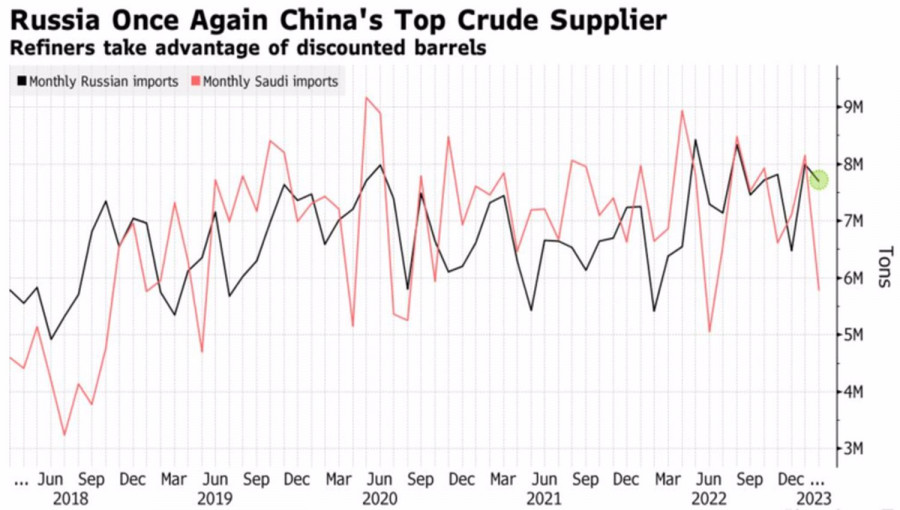 Moskva našla někoho, komu prodá svou ropu a další zboží. Podle čínského celního úřadu Čína v únoru dovezla z Ruska 7,69 milionu tun ropy, což odpovídá 2 milionům barelů denně. Předstihlo Saúdskou Arábii a stalo se největším dodavatelem ropy do největší asijské ekonomiky. Pro srovnání, nabídka Rijádu v únoru meziměsíčně klesla o 29 % na nejnižší úroveň od června.