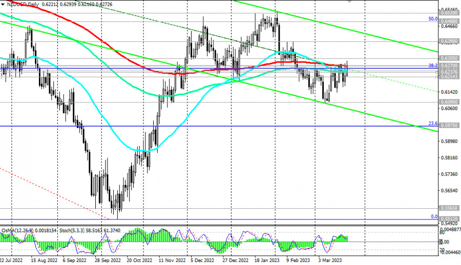 Pár NZD/USD rozvíjí od začátku měsíce uptrend a míří k zóně rovnováhy a klíčovým úrovním rezistence 0,6230 (200 EMA v denním grafu) a 0,6258 (50 EMA v týdenním grafu a Fibonacciho úroveň 38,2 % klesající vlny od hladiny 0,7465 z února 2021 k hladině 0,5510 z října 2022). -