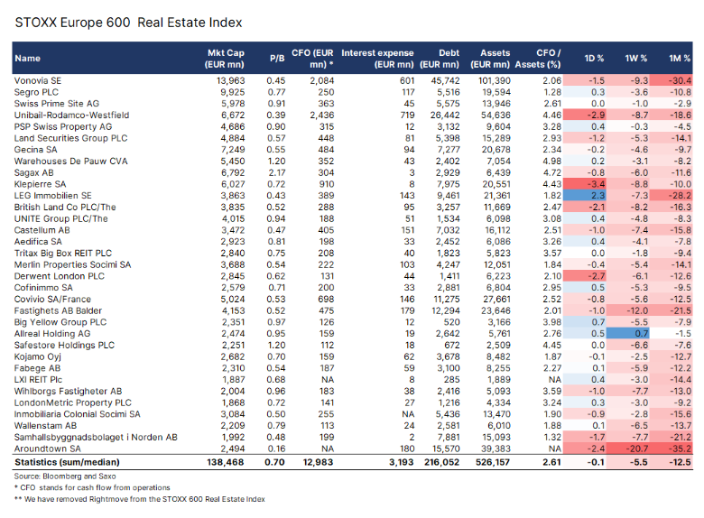33 realitních společností z indexu STOXX Europe 600 Real Estate Index představuje tržní hodnotu 138 miliard euro a spravuje aktiva v celkové ceně 526 miliard euro. Hodnota těchto aktiv už neodráží skutečnou hodnotu, což je vidět na P/B poměru, který se u celého odvětví propadl na 0,7x. Lze tedy očekávat propad hodnoty těchto aktiv. Tato dynamika se podepisuje i na záruční hodnotě pro banky, takže se zpřísní podmínky pro nové půjčky.
