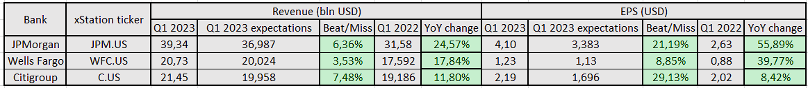 Největší americké banky JP Morgan&Chase (JPM.US), Wells Fargo (WFC.US) a Citigroup (C.US) vykázaly za 1. čtvrtletí finanční výsledky, které překonaly očekávání analytiků z Wall Street. Dobré výsledky zmírnily obavy z bankovní krize a akcie těchto společností před otevřením burzy posilují. Akcie JP Morgan posílily o téměř 6 %, Wells Fargo o 4 % a Citigroup se v předobchodní fázi obchodování obchodovala o 2 % výše. Banky zároveň stanovily vyšší rezervy na úvěry, což signalizuje opatrnost ohledně dopadu zpřísnění opatření Fedu na ekonomiku a finanční zdraví některých klientů.