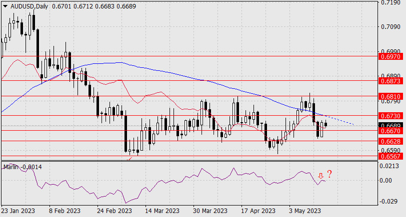 Aussie ve čtvrtek neochvějně zamířil k cílovému supportu 0,6686 (maximum z března 2020). Této úrovně pár dosáhl dnes ráno. Oscilátor Marlin podle denního grafu klesá ve vlastním sestupném kanálu a nyní čekáme, až signální linie najde svoji spodní hranici. -
