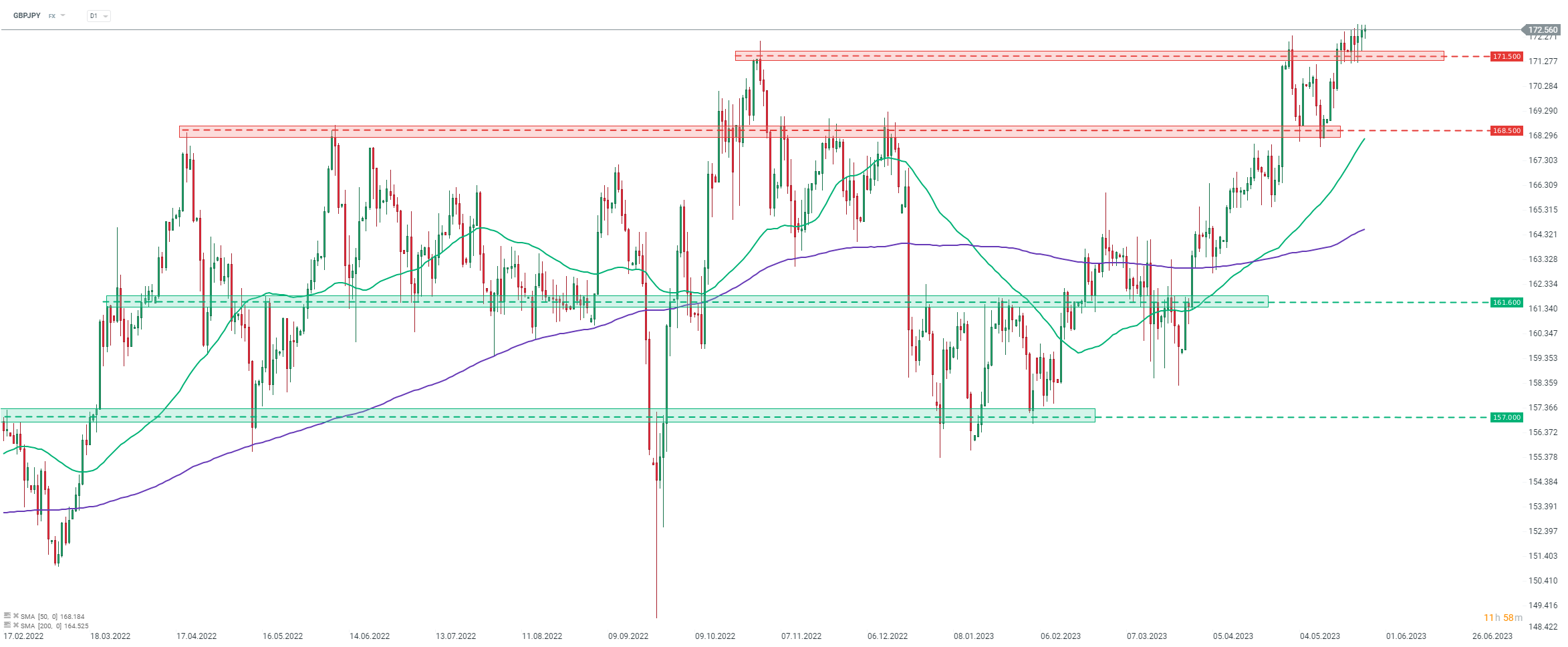 Jak jsme již uvedli v úvodním odstavci, nedávné oslabení GBPUSD je způsobeno posilováním USD. Pokud se však podíváme na ostatní páry vázané na GBP, vidíme, že GBP se v poslední době drží poměrně pevně. Podíváme-li se na graf GBPJPY v intervalu D1, vidíme, že se páru podařilo prorazit nad zónu odporu 171,50 a dosáhnout nejvyšší úrovně od začátku roku 2016.