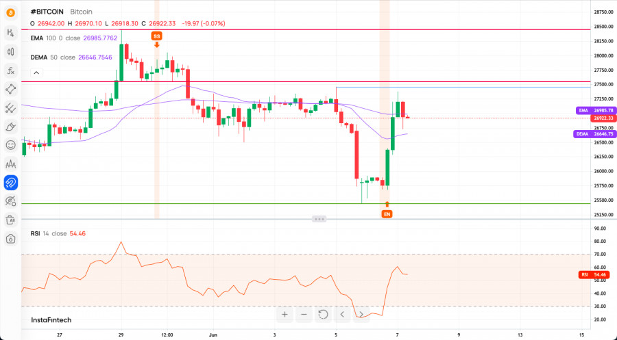 Pár BTC/USD provedl na minimech 25 442 USD obrat ve tvaru písmene V a momentálně se obchoduje nad 50 a 100 MA kolem hladiny 27 000 USD. Další cíl býků vidíme na hladině 27 452 a 27 570 USD. Klíčovou krátkodobou technickou rezistencí je swingové maximum na hladině 28 446 USD a jen trvalý průraz nad ni by byl považován za zřetelněji býčí. Intradenní technický support se nachází na ceně 25 892 USD. Silné a pozitivní momentum v grafu časového rámce H4 podporuje krátkodobý býčí výhled pro bitcoin.