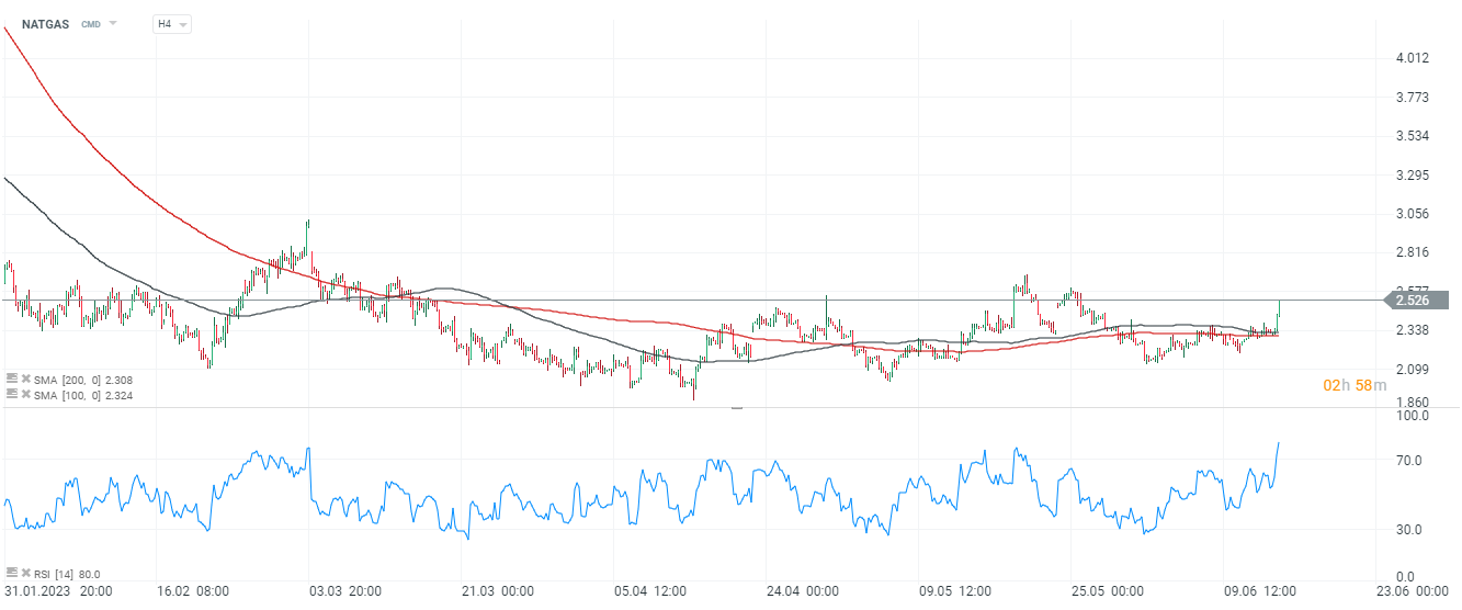 NATGAS získává a proráží nad SMA200 a SMA100. Index RSI je na úrovni 80 bodů a indikuje překoupenost. Zdroj: xStation5