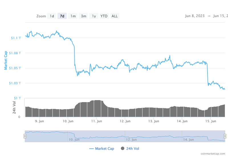 Sedmidenní graf tržní kapitalizace navíc znázorňuje výrazný pokles hodnoty 14. června. Ke konci tohoto dne se tržní kapitalizace snížila z přibližně 1,058 bilionu USD na přibližně 1,023 bilionu USD. V době psaní tohoto článku dále klesla na zhruba 1,015 bilionu USD.