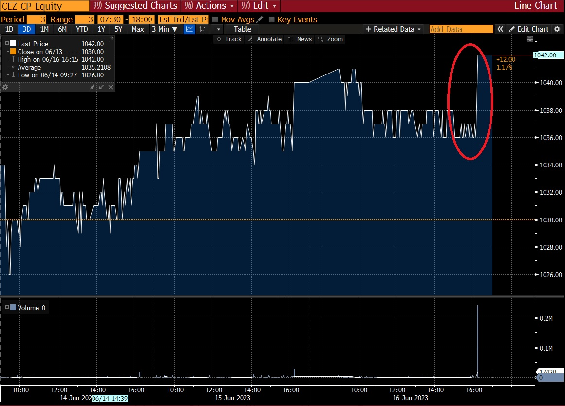 Několik lidí zřejmě o záměru ministerstva financí říci si o výrazně vyšší dividendu ČEZ vědělo již před zavřením burzy a tuto neveřejnou informaci také těsně před zavřením burzy tito „šťastlivci“ zobchodovali. Pročež akcie výrazně vyskočily, stejně jako zobchodovaný objem (viz grafy Bloombergu níže: horní graf zachycuje cenu, spodní zobchodovaný objem, jenž nebývale narostl). Záměr říci si o vyšší dividendu je pozitivní zprávou pro cenový vývoj dané akcie.