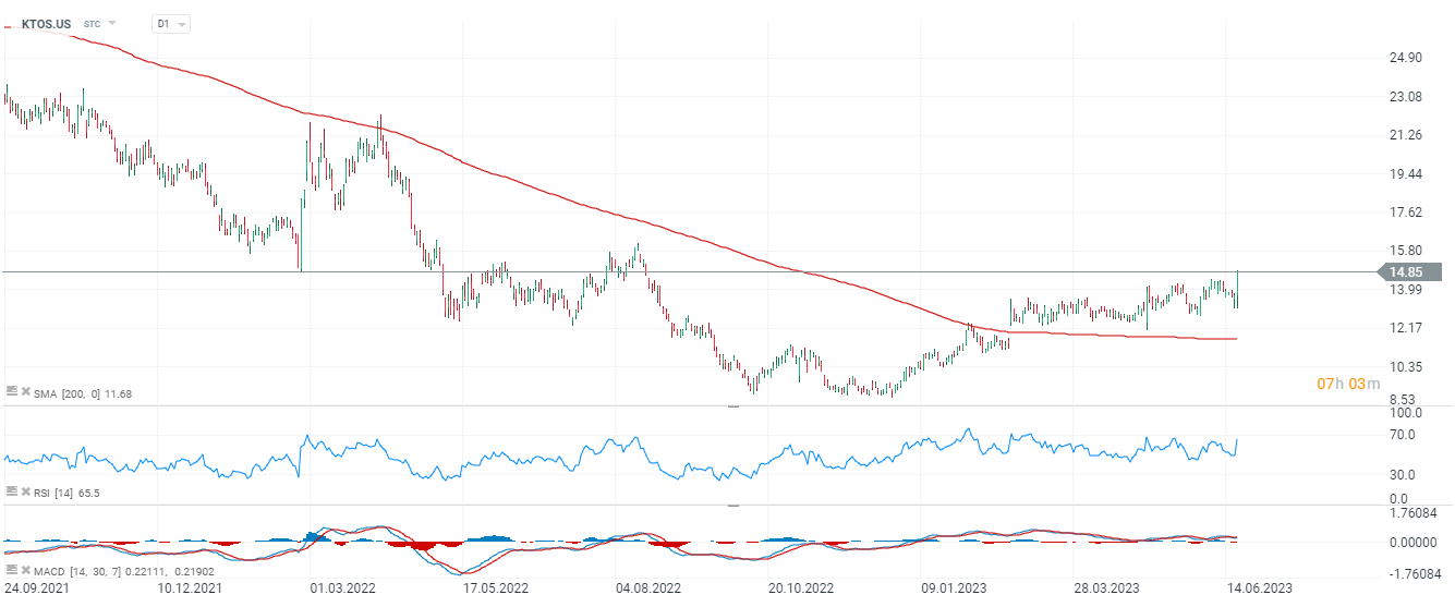 Akcie společnosti Kratos (KTOS.US) prolomily dlouhodobý klesající trend (SMA200) a od prosincového minima posílily o téměř 80 %. Zdroj: xStation5