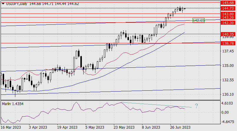 Měnový pár USD/JPY se po šestimístném poklesu snaží zotavit k magnetickému bodu, který v denním grafu tvoří průsečík linií rovnováhy a MACD. Cena směřuje k cílové úrovni 155,75, ale této hranice dosáhne pouze v případě, že se oscilátor Marlin nevrátí od linie nula zpět, ale naopak ji překoná. -