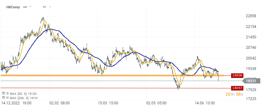 Čínsky index Hang Seng (HKComp) pokračoval v slabšej výkonnosti druhý deň po sebe a zaznamenal výrazný pokles. Index sa blíži k svojmu ročnému minimu, pričom sa blíži k hranici 18 067 bodov Zdroj: xStation5