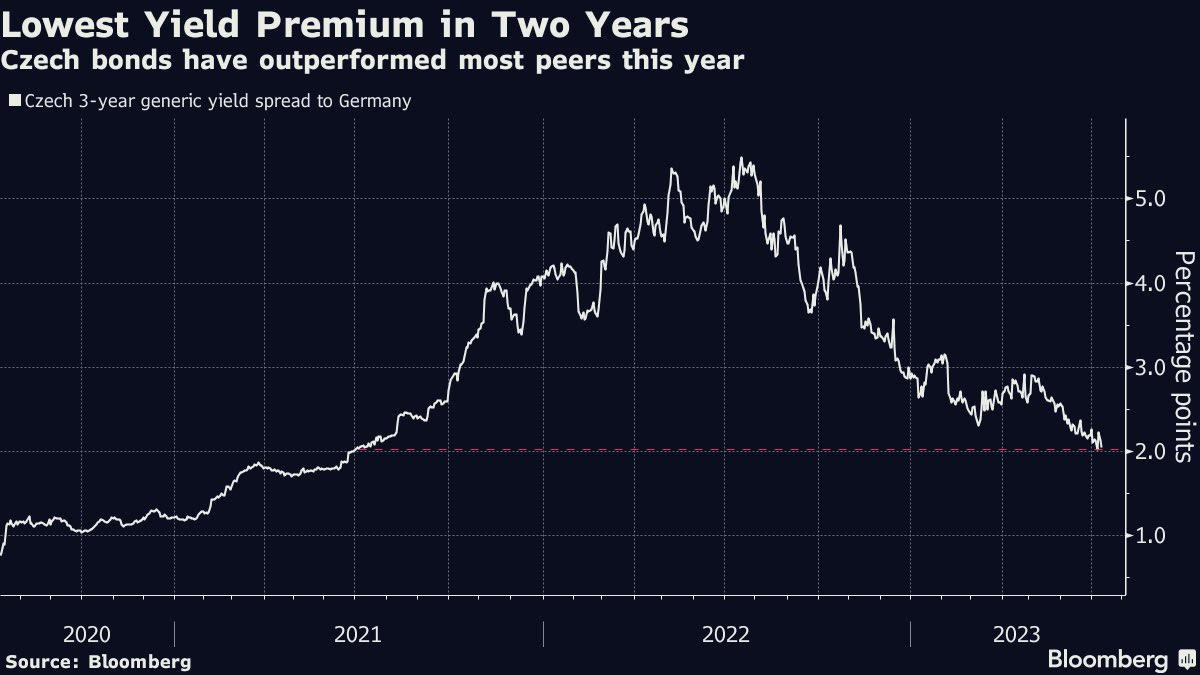 Například rozdíl mezi úrokem tříletého dluhopisu vlády České republiky a tříletého dluhopisu vlády německé se nyní pohybuje těsně nad úrovní dvou procentních bodů, jak plyne z dat agentury Bloomberg (viz graf níže). Jedná se o nejnižší hodnotu tohoto rozdílu za poslední přibližně dva roky.