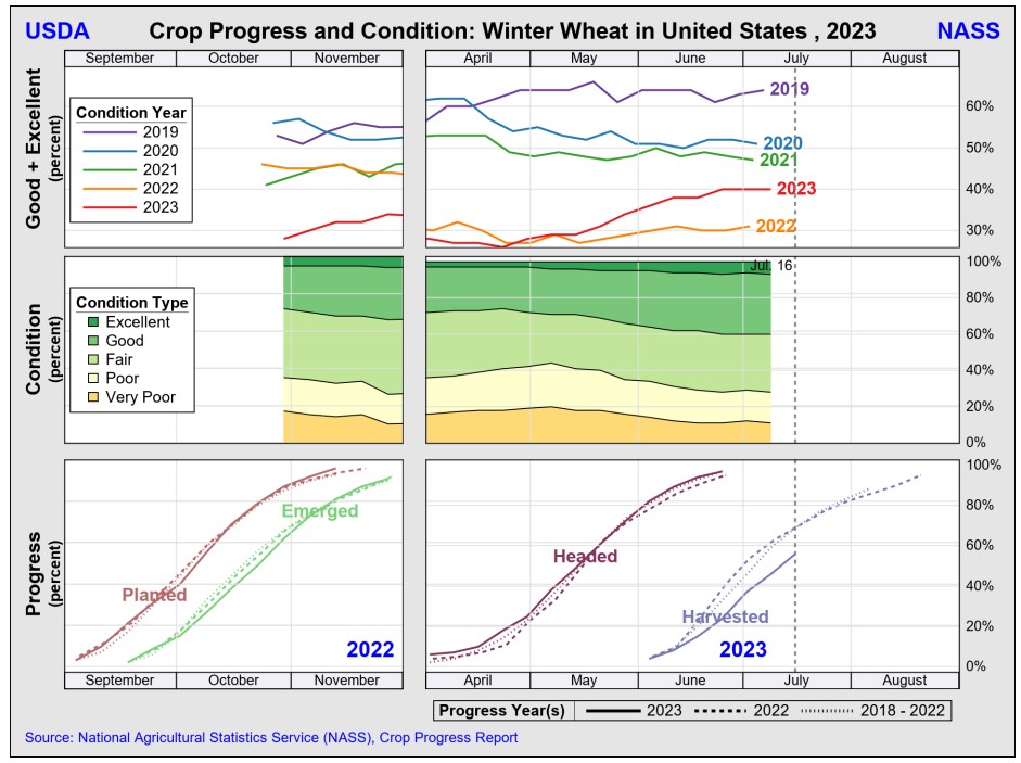 - V USA mezitím pokračuje sklizeň ozimé pšenice, ale nejpomalejším tempem od 60. let minulého století. Kvalita sklizně byla jen mírně vyšší než v loňském roce