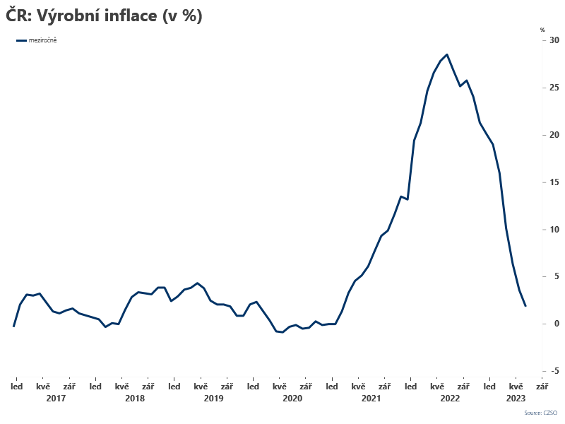 Výrobní ceny v září podle očekávání trhů klesly na 41,9 % meziročně oproti revidovaným 43,4 % v srpnu. -