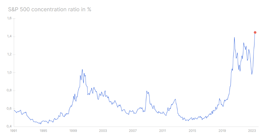 Dalším rizikem, které se vrátilo a o kterém jsme si mysleli, že se již nikdy nebude opakovat, je koncentrace amerického akciového trhu. Rally v letošním roce táhne úzká skupina megakapitálů, protože se očekává, že nastupující technologie umělé inteligence přinese velkým technologickým akciím nejvyšší ekonomické zisky. Hlubší problém spočívá v tom, že americký akciový trh se posunul ke koncentraci váhy indexů, kterou jsme nikdy předtím neviděli, přičemž 10 největších akcií tvoří 30,4 % indexu S&P 500 a Herfindahl-Hirschmanův index je o 40 % vyšší než koncentrace trhu v době vrcholu dot-com bubliny. Díky tomu je americký akciový trh křehčí a citlivější na menší počet rizikových faktorů. V důsledku toho jsme přešli k negativnímu pohledu na megakapitály a převážili jsme dlouhý chvost akcií oproti megakapitálům.