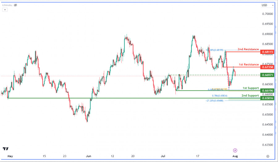 Možná dojde k býčímu odrazu od prvního supportu 0,6637, což je overlap support. Tento support nabírá na síle díky přítomnosti Fibonacciho retracementu 61,80 % a Fibonacciho projekce 78,60 %, které ukazují na Fibonacciho konfluenci. Druhý support na úrovni 0,6568 navíc slouží jako pullback support, což tuto zónu supportu ještě posiluje. -