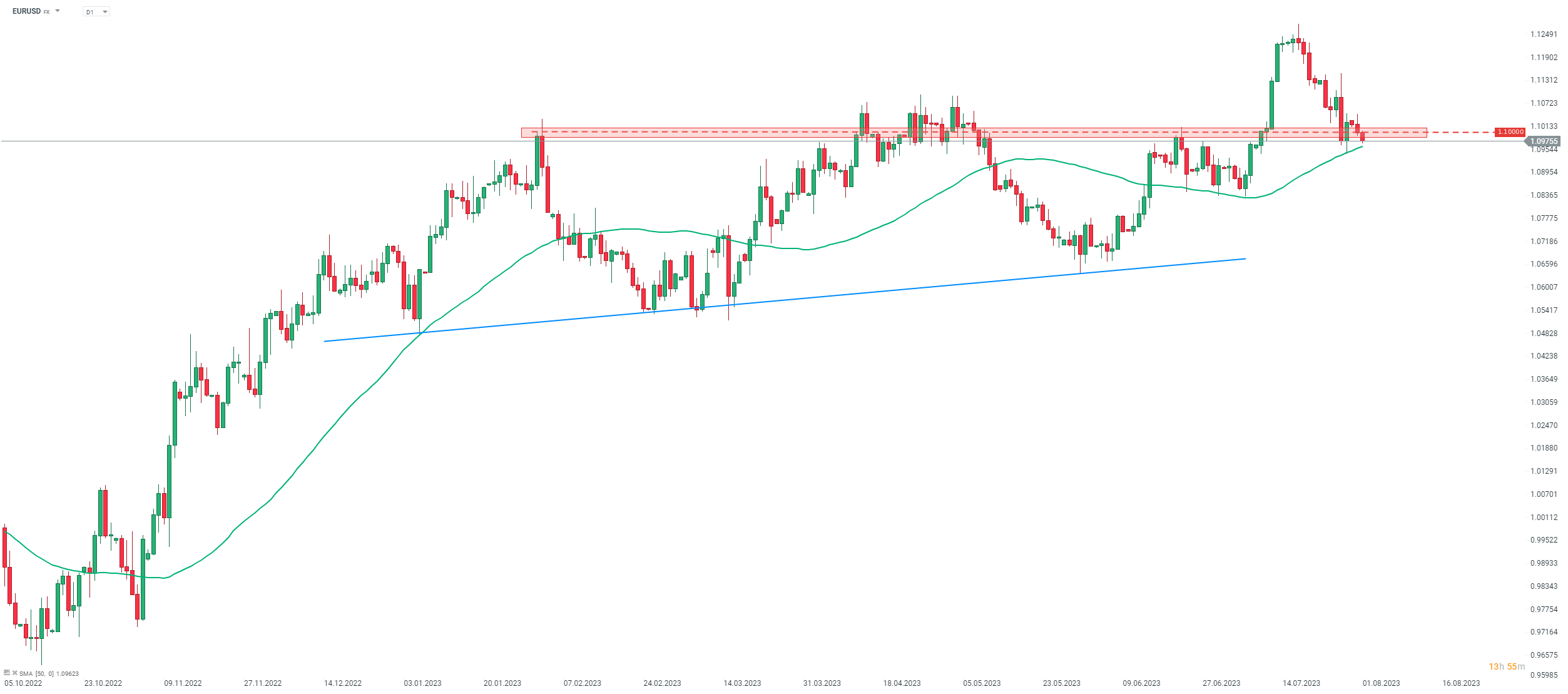 Zatímco EURUSD nezaznamenal žádnou výraznější reakci na revizi PMI, pár dnes pomalu pokračuje v pohybu směrem dolů a proniká pod zónu podpory 1,10. Zdroj: xStation5