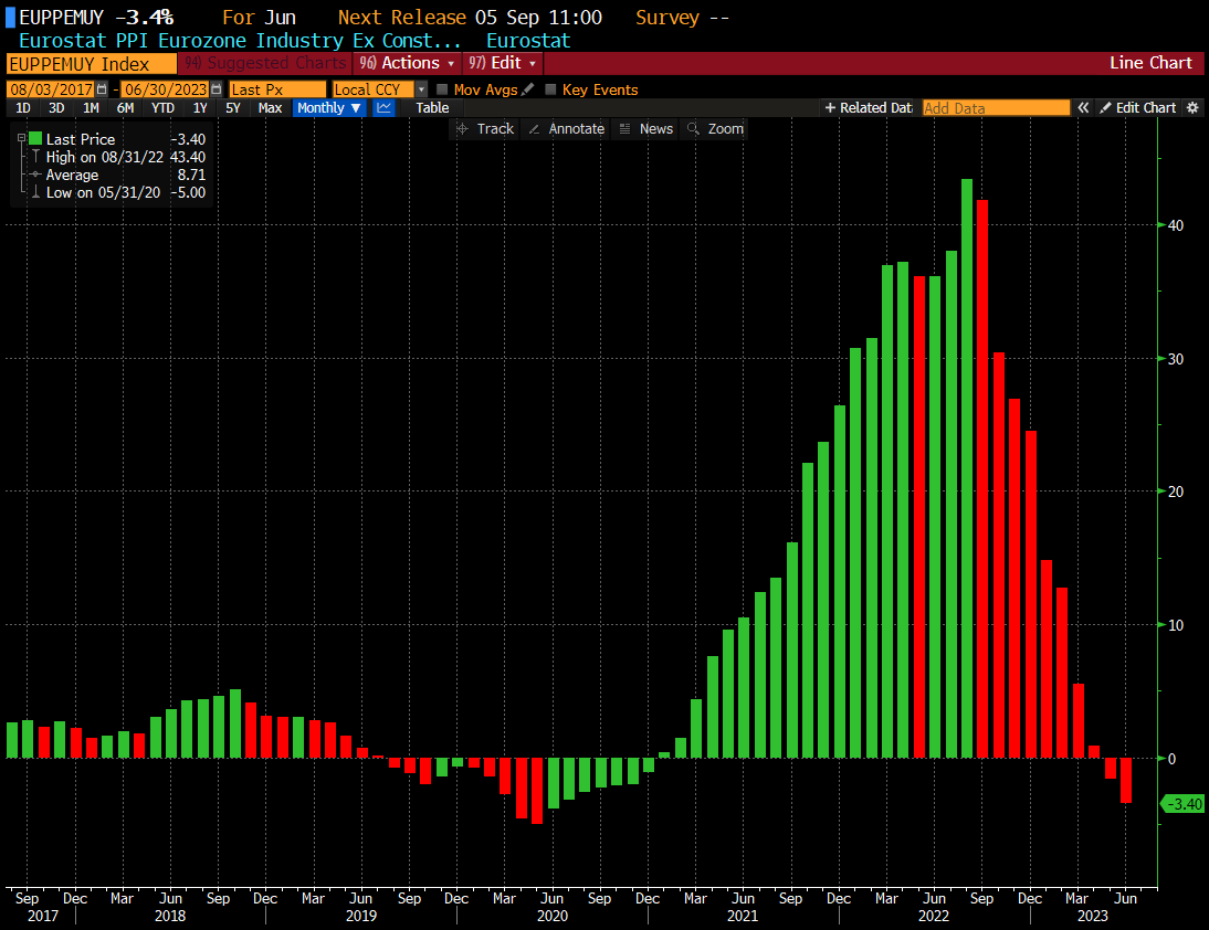Červnový údaj o inflaci PPI v eurozóně naznačil druhý měsíc po sobě, kdy došlo k meziročnímu poklesu výrobní inflace.