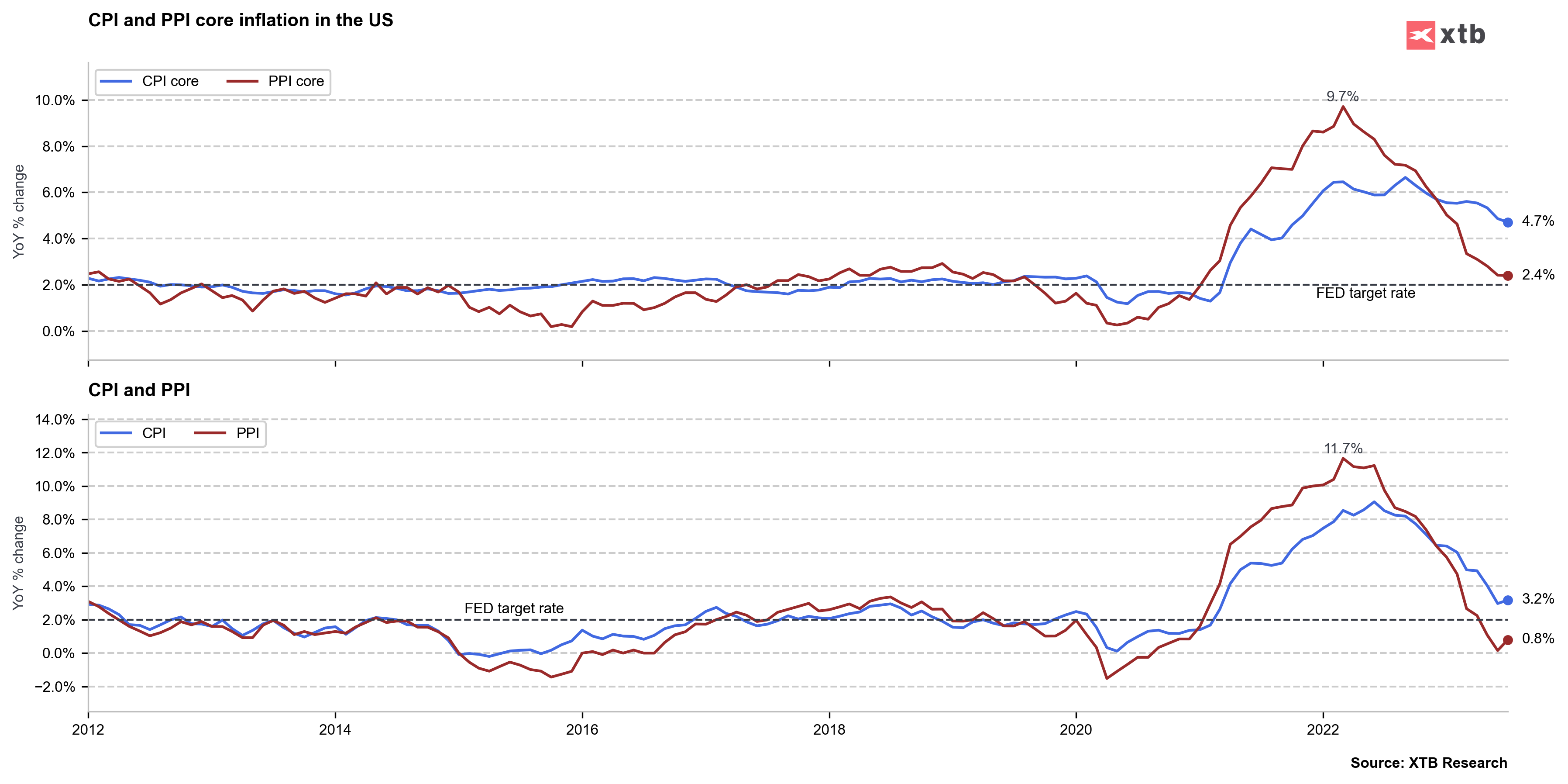 Americký Úřad pro statistiku práce v červenci oznámil sezónně očištěný růst indexu cen výrobců pro konečnou poptávku o 0,3 % po nezměněných cenách v červnu a poklesu o 0,3 % v květnu. Za dvanáct měsíců se index zvýšil o 0,8 %. Tento nárůst byl ovlivněn 0,5% vzestupem cen služeb konečné poptávky a nepatrným 0,1% zvýšením cen zboží konečné poptávky. Za zmínku stojí, že 40 % růstu cen služeb konečné poptávky bylo způsobeno 7,6% nárůstem cen správy portfolia. Index služeb konečné poptávky zaznamenal největší nárůst od srpna 2022, zatímco ceny masa v rámci zboží konečné poptávky vyskočily o 5,0 %. Výrazně však poklesly ceny motorové nafty, a to o 7,1 %.