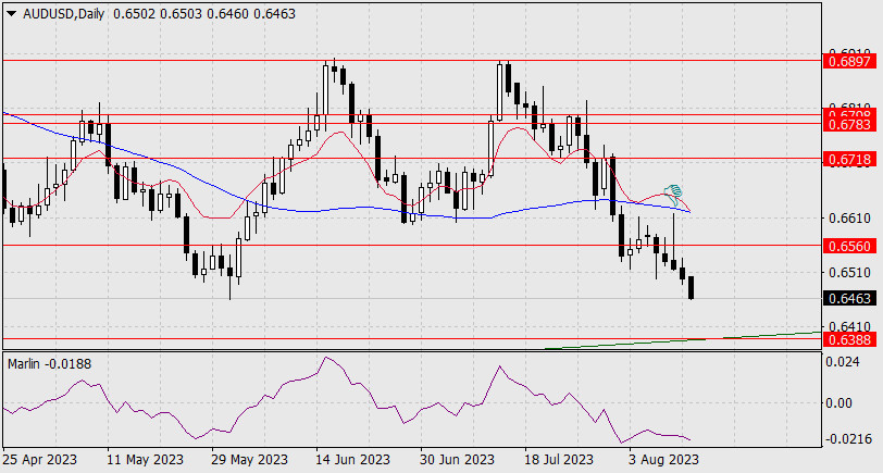 Po falešném pohybu vzhůru 10. 8., pár AUD/USD ve střednědobém horizontu nadále klesal. Úroveň supportu na 0,6388 je těsně před námi a vytváří magnetický bod průsečíku s linií zeleného cenového kanálu.