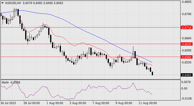 Na čtyřhodinovém grafu se cena usadila pod oběma indikátorovými liniemi a s podporou klesajícího Marlin oscilátoru přetrvává klesající pohyb. Korekce je vysoce pravděpodobná po dosažení cílové úrovně 0,6388.