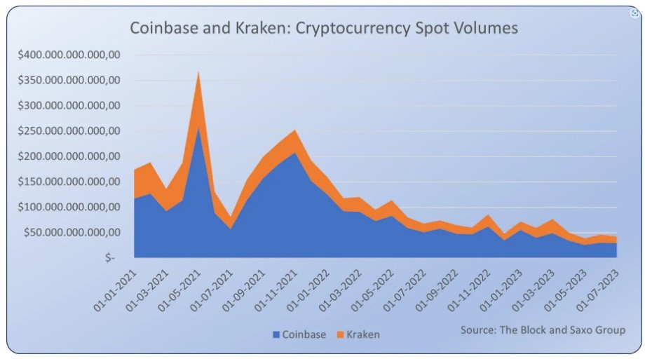 Propad objemů kryptoměn hezky ilustruje následující graf. Ten ukazuje měsíční spotové objemy na Coinbase a Krakenu od počátku roku 2021 až do července 2023. Coinbase a Kraken jsou pro většinu světa, zejména pro Evropu a Severní Ameriku, hlavními vstupními branami na kryptoměnový trh s klíčovou úlohou. Je evidentní, že se za posledního 2,5 roku spotové objemy na Coinbase i na Krakenu značně propadly. Nejnižší celkový objem obchodování byl zaznamenán v květnu letošního roku, kdy na obou burzách dohromady dosáhl pouhých 39 miliard USD. Ještě v květnu 2021 činil kombinovaný objem obchodování Coinbase a Krakenu 369 miliard USD. To je za dva roky už pořádný propad.