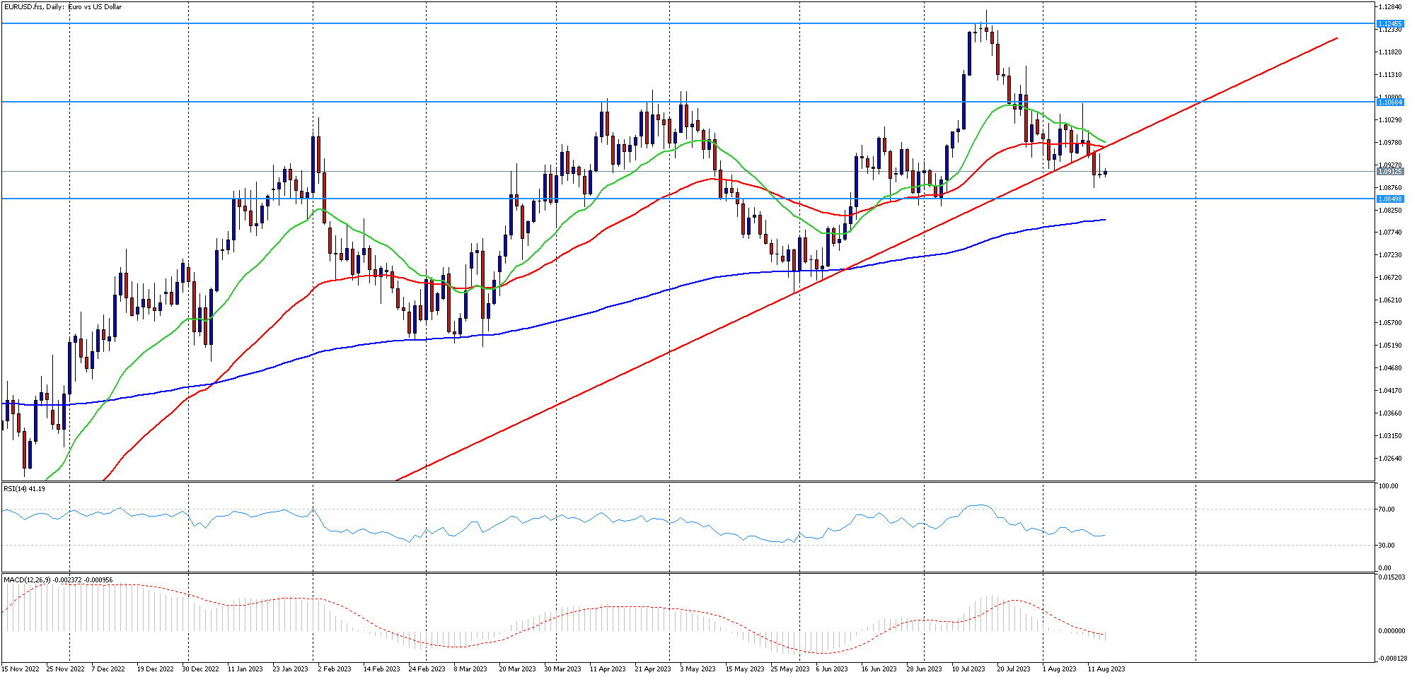 Měnový pár EUR/USD znovu klesá, protože krátkodobý růstový trend, který začal na začátku června, se zřejmě zastavil. Vzestupná trendová čára z 28. září 2022 působí jako silná rezistence a tlačí EUR/USD k 50dennímu jednoduchému klouzavému průměru na úrovni 1,0874.
