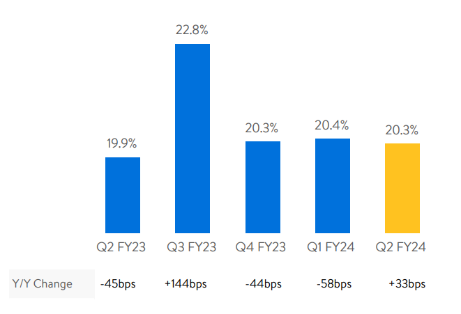 Hrubá marže společnosti WalMart vykázala kladné tempo růstu, nicméně po zbytek čtvrtletí mírně klesala. Zdroj: WalMart