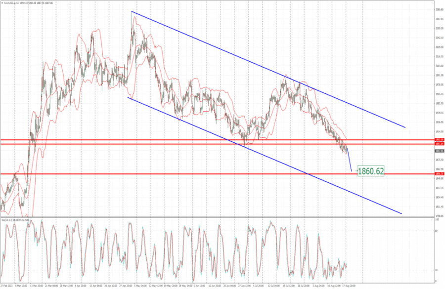 Zlato se obchoduje v bočním pásmu na ceně 1 887 USD, ale v klesajícím trendu, což je známka možného pokračování poklesu.