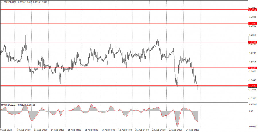 Pár GBP/USD se v grafu 30M dál pohybuje v bočním kanálu. Stále se přikláníme k dalšímu poklesu libry, protože se domníváme, že je momentálně překoupená a nepřiměřeně drahá. Cena ale zatím neukončila fázi konsolidace, takže by se mohla znovu odrazit od úrovně 1,2620, což by mohlo podpořit růst páru. Klíčové úrovně v grafu 5M jsou 1,2457, 1,2499, 1,2538, 1,2605–1,2620, 1,2653, 1,2688, 1,2748, 1,2787–1,2791 a 1,2848–1,2860. Jakmile se cena po otevření obchodu posune o 20 pipů ve správném směru, můžete na breakeven nastavit příkaz stop loss. V pátek není ve Spojeném království naplánováno nic zvlášť zajímavého. Investoři budou čekat na Powellovy komentáře na sympoziu v Jackson Hole.