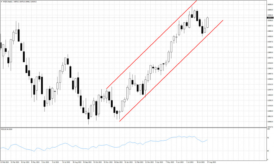 NASDAQ vykazuje po třítýdenní korekci z 15 824 na 14 554 bodů známky obnovení střednědobého býčího trendu. Navzdory pullbacku respektuje hranice kanálu. Index se stále obchoduje uvnitř býčího kanálu, ve kterém byl od září 2022. Zatím druhý týdenní býčí svícen, ve kterém aktuálně jsme, je pevný svícen, který prorazil nad předchozí týdenní maximum. Support se nachází na minimu z minulého týdne 14 554. Tady také najdeme spodní hranici kanálu. Dokud cena bude nad touto úrovní, zůstane střednědobý trend býčí.