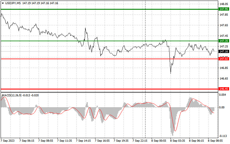 Při nákupu se ujistěte, že linie MACD leží nad nulou nebo od ní právě začíná stoupat. Nákup páru USD/JPY zvažte i po dvou po sobě jdoucích testech ceny 147,02, ale linie MACD by měla být v přeprodané oblasti, protože jen tak se trh obrátí k úrovním 147,35 a 147,95.