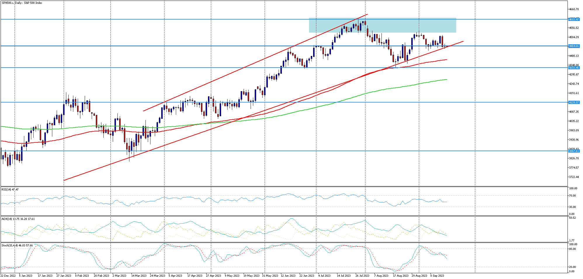 S&P 500 se nemůže dostat přes hranici rezistence na ceně 4156,32, kde se trh odrazil a začal klesat až k rostoucí trendové čáře. Je potřeba zmínit, že index S&P 500 se od začátku roku obchoduje v rozmezí 9,7 procentuální bodu, což je nejužší rozmezí za srovnatelné období od roku 2017. -