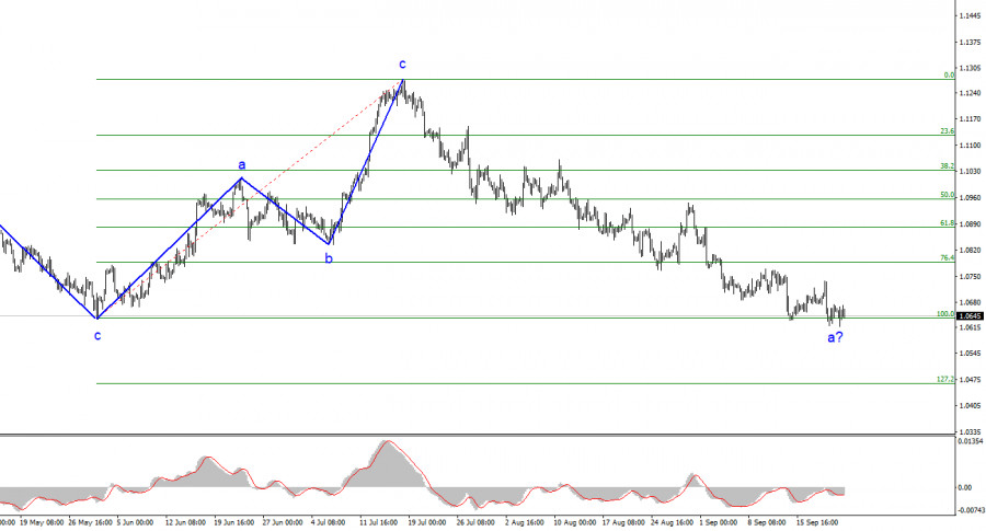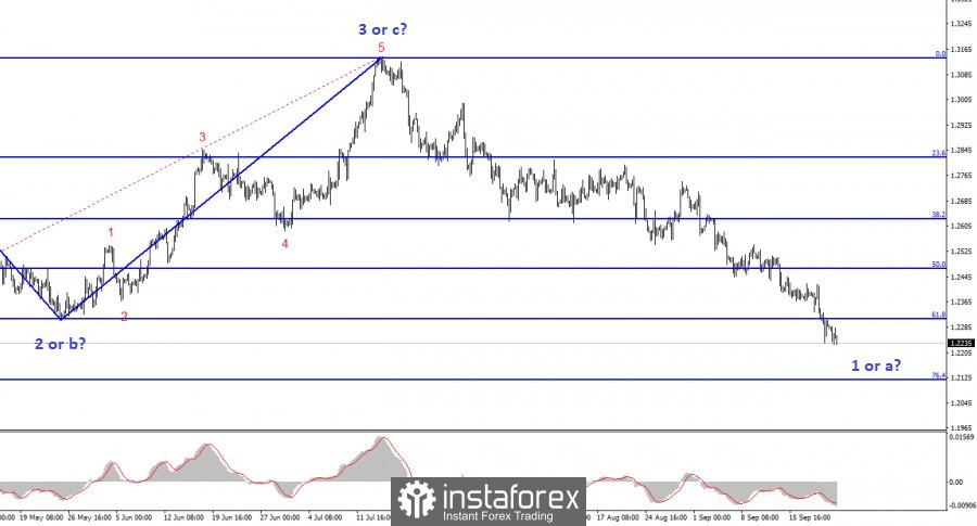 Vlnový pattern nástroje GBP/USD naznačuje pokles v rámci sestupného trendu. Existuje riziko dokončení současné klesající vlny, pokud se jedná o vlnu d, ale podle mého názoru v současné době pozorujeme formování první vlny sestupného trendu. Britská libra může v blízké budoucnosti očekávat maximálně vytvoření vlny 2 nebo b. Doporučil bych vám být obezřetní, pokud jde o prodej, protože v blízké budoucnosti může začít korekční vzestupná vlna. V současnosti však neexistují žádné signály, které by naznačovaly začátek této vlny.