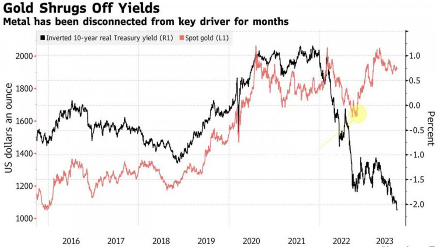 Ke zklamání zlatých nadšenců nepřicházejí pozitivní zprávy. Investoři si postupně zvykají na myšlenku, že vysoké úrokové sazby zde zůstanou ještě dlouho. Cena peněz se prudce zvýšila, a ještě dlouho to tak bude. Drahý kov ztratí lesk a začne dělat to, co by měl, a to klesat.