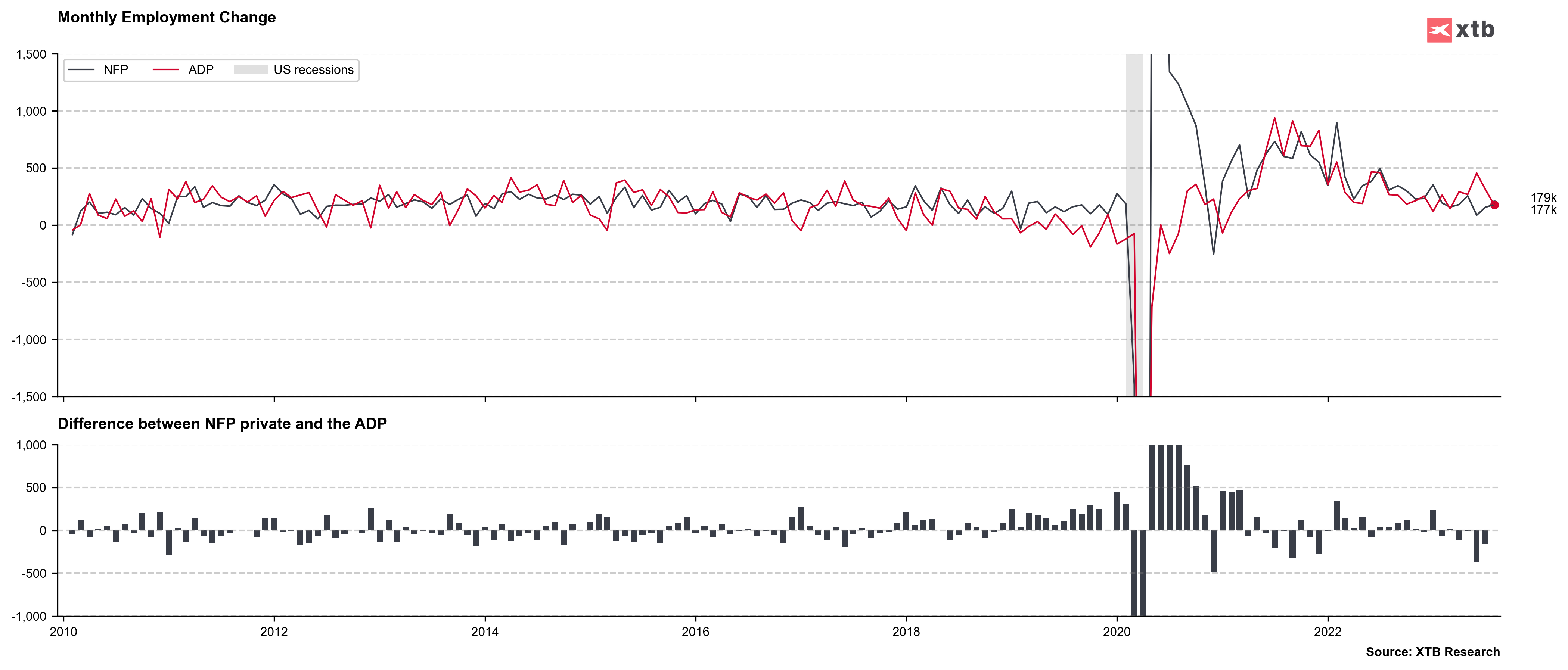Soukromá zpráva NFP vyšla za srpen téměř v souladu se zprávou ADP. Zdroj: Bloomberg Finance LP, XTB