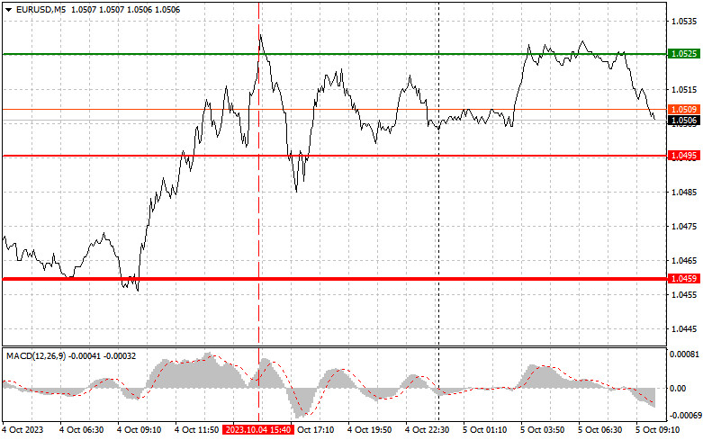 Pár EUR/USD dosáhl úrovně 1,0531, což dalo trhu signál k prodeji, ovšem linie MACD byla daleko od nuly a omezila tím sestupný potenciál páru. Druhé testování úrovně však vedlo k poklesu o 10 bodů, protože v té době byla linie MACD v překoupené oblasti. Třetí test mezitím vyvolal signál k nákupu, což vedlo k nárůstu páru o více než 30 bodů. -