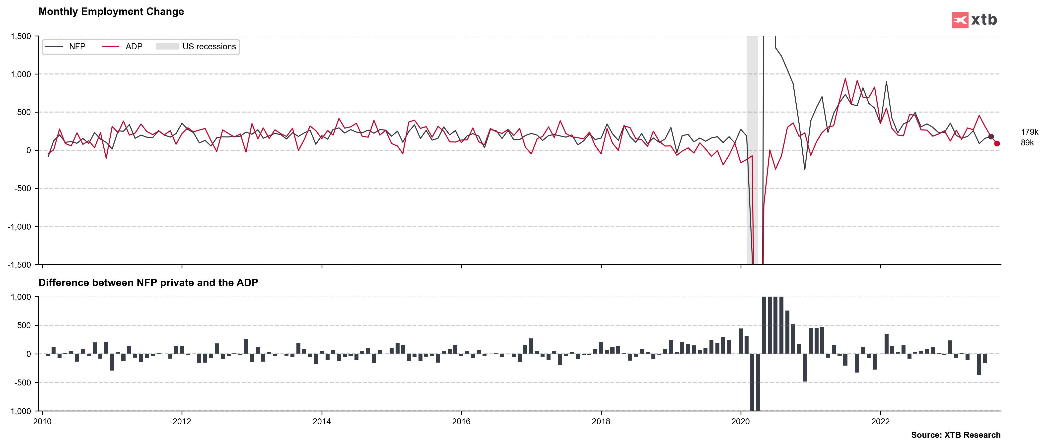 Zpráva ADP za září naznačila slabý nárůst pracovních míst o pouhých 89 tisíc. Zdroj: Bloomberg Finance LP, XTB Research
