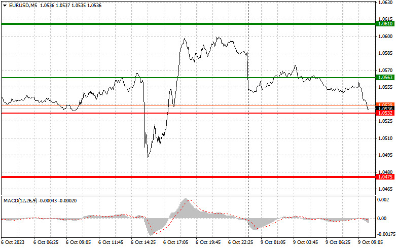 Test úrovně 1,0532 se shodoval s poklesem linie MACD od nuly a vyvolal prodejní signál, který vedl k poklesu ceny o zhruba 40 pipů.