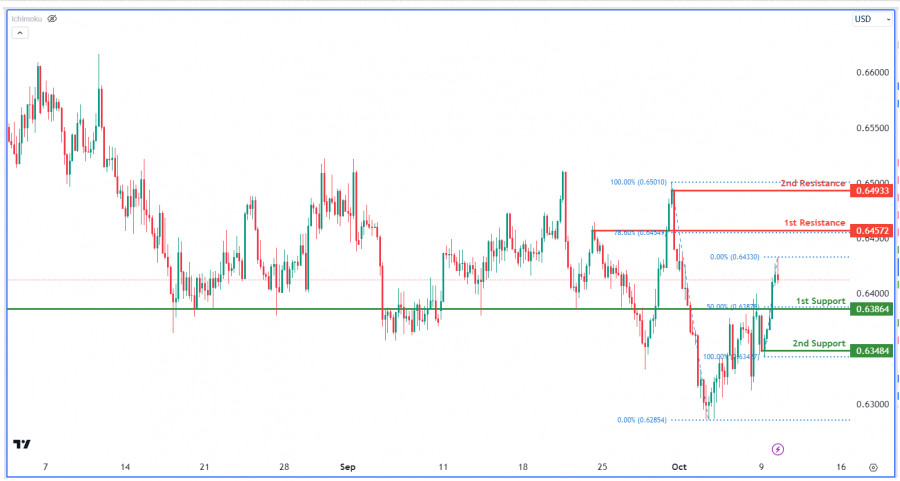 Ve směru nahoru je 1. rezistence na úrovni 0,6457 identifikována jako swingová rezistence, která se shoduje s Fibonacciho retracementem 78,60 %. Dále, 2. rezistence na úrovni 0,6493 je také označena jako rezistence swingového maxima.