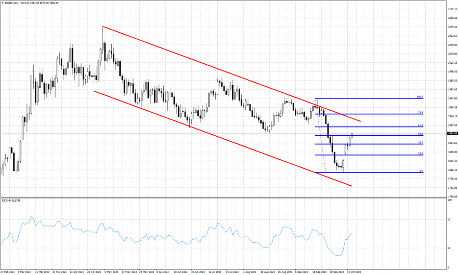 Cena zlata se pohybuje kolem 1 870 USD. V pátek se vymanila z černého krátkodobého medvědího kanálu a nabídla první známku obratu. Zůstává uvnitř střednědobého medvědího kanálu. Když cena opustila černý kanál, hovořili jsme o jejím potenciálním růstu k horní červené hranici kanálu 1 900 USD. Když se obchodovala kolem 1 800 USD, mnohokrát jsme zmínili, že pokles je omezený a očekáváme odraz. Teď, když cena roste, pozorujeme, že RSI dosáhl přeprodaných úrovní. V podobném případě v minulosti, kdy byl RSI na současných úrovních, byl růst omezený a následoval silný pokles. Proto musí být obchodníci opatrní a nesmí si příliš věřit. -