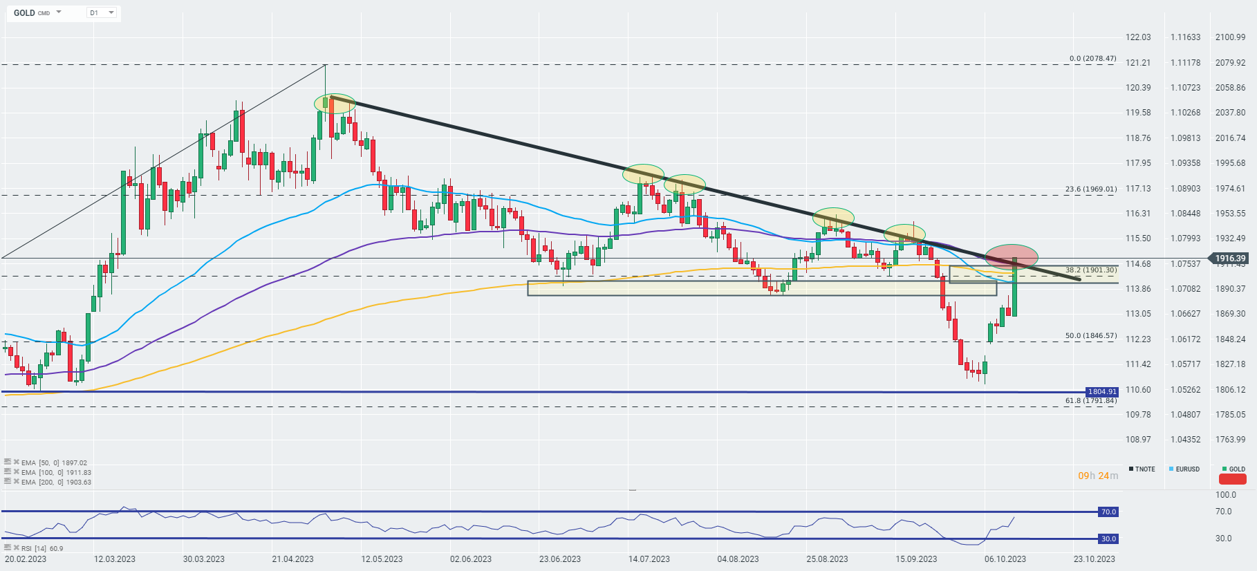 Zlato rozšiřuje masivní zisky a v tuto chvíli zlato získává více než 2,66 % během dne. A co víc, zlato dnes prolomilo psychologickou bariéru 1 900 dolarů za unci a nyní testuje horní hranici střednědobého klesajícího kanálu vyznačeného na grafu níže.