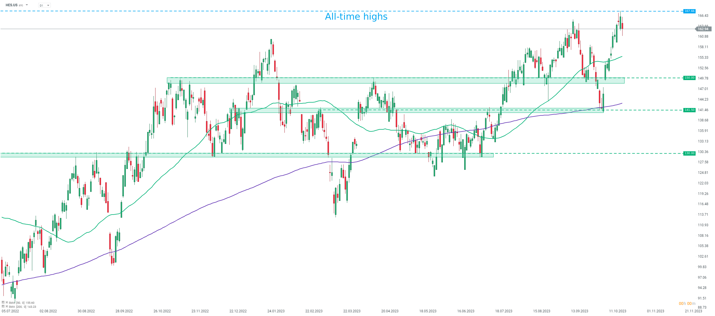Hess (HES.US) se v premarketu obchoduje o 3% výše, téměř 168 USD za akcii, zatímco Chevron (CVX.US) klesá o více než 2 %. Když se podíváme na Hessův graf v intervalu D1, můžeme vidět, že společnost se dnes začne obchodvat blízko nedávno dosažených historických maxim.