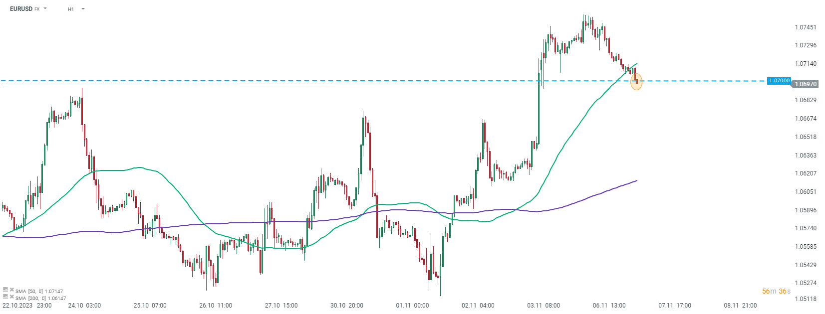 EURUSD klesl pod hranici 1,07 po neuspokojivé zprávě o německé průmyslové výrobě za září. Zdroj: xStation5