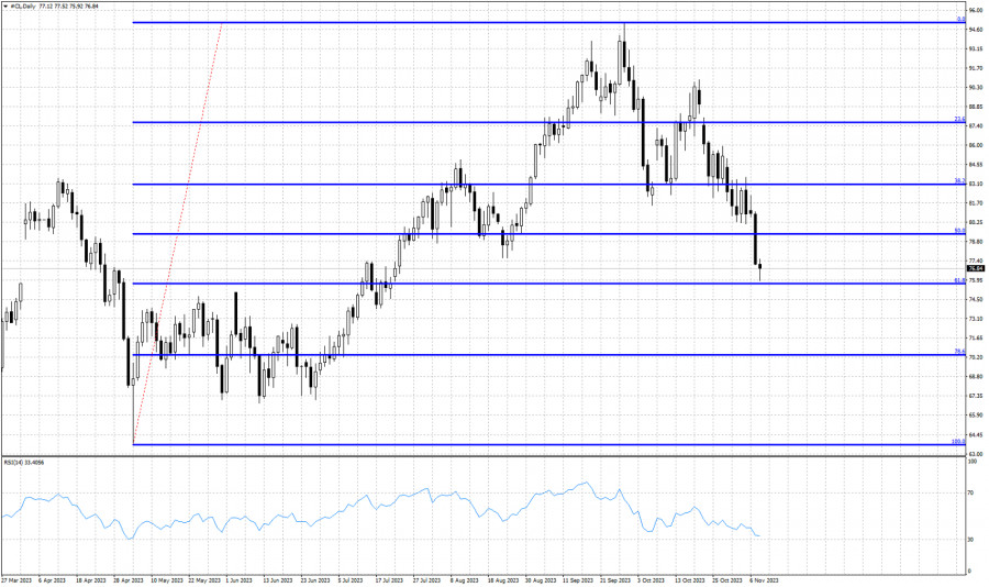 Cena ropy se obchoduje kolem 76 až 77 USD. Krátkodobý trend zůstává medvědí, protože cena stále vytváří nižší minima a nižší maxima. Býci dostali před několika týdny varování, když se cena ropy vymanila z býčího kanálu, ve kterém byla, zpětně ho zespodu otestovala a byla odmítnuta. Cena ropy dnes dosáhla úrovně Fibonacciho retracementu 61,8 % celého vzestupného pohybu. Jedná se o velmi důležitý support. Na úrovni retracementu 61,8 % obvykle dochází k obratu trendu. Obchodníci proto musí být velmi opatrní. Z technického hlediska není potvrzen obrat nahoru. Krátkodobý trend stále ovládají medvědi.