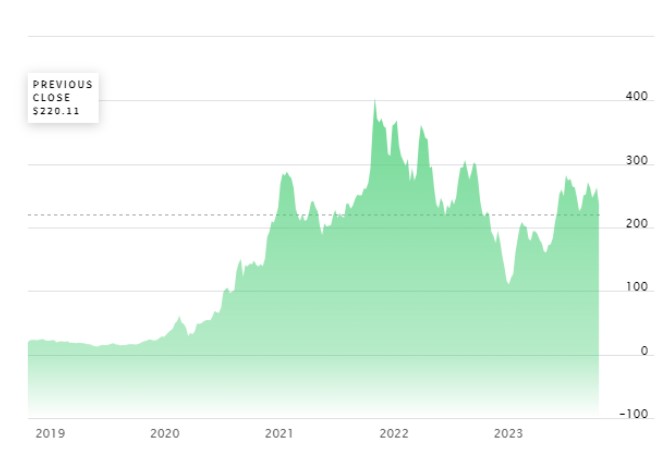 Níže si můžete prohlédnout graf ukazující cenu akcií společnosti Tesla, Inc. (TSLA) za posledních 5 let.