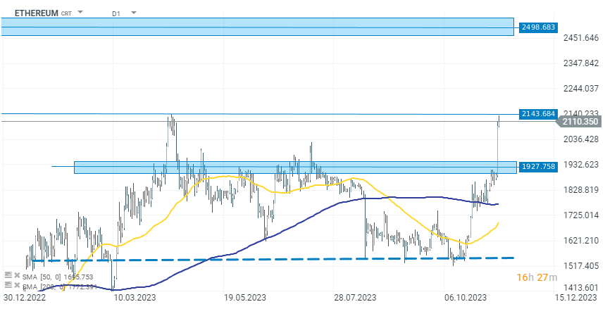 Ethereum vzrostlo o více než 10 % na 2120 USD po zprávě o podání žádosti o spotový ETF společností BlackRock. V současné době se Ethereum potýká s posledním lokálním vrcholem z první poloviny letošního roku. Pokud bude proraženo, cesta vzhůru bude otevřená. Zdroj: xStation 5.
