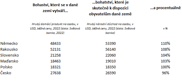 V roce 2022 bylo Česko mezi okolními zeměmi jedinou, jejíž obyvatelé měli k dispozici méně bohatství, než kolik reálně vytvořili, a to pouze zhruba 96 procent. Hrubý národní důchod v přepočtu na osobu totiž zaostal za hrubým domácím produktem v přepočtu na osobu, jak ukazují data Světové banky (viz tabulka níže).